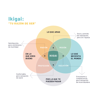 El Ikigai es un concepto japonés que significa "razón de ser". Representa la intersección entre: